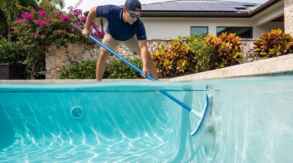 Vacuuming: Removes settled debris from the pool floor. Some service providers rely entirely on automatic cleaners for this and only manually vacuum when there’s visible debris. That approach works in pools with relatively low debris loads. In eastern Puerto Rico—where rain showers can blow in daily, bringing with them organic matter—manual vacuuming catches what automatics miss, particularly in corners and along the water line.